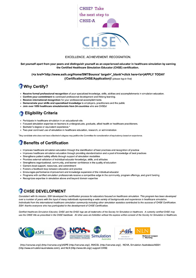 如果您希望檢驗自己在醫療模擬教學的能力與成就,那麽你有必要參加這個考試,確認您在模擬醫療教學的貢獻,讓國際醫學模擬機構承認您的努力,也表示您願意承諾為此事業持續發展和終身學習。