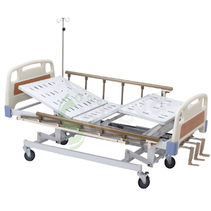 规格:2120*970*450-720mm(L*W*H) 手动三摇(背部上升0~75°;腿部上升0~40°;整体升降0~270mm)整体升降270mm 钢塑板面 铝合金护栏 树脂脚轮 保护螺杆 ABS床头尾板 床面采用进口冷轧钢板一次冲压成型,超声波除锈,表面静电粉末喷塑,抗击耐腐蚀,不褪色 可选配:固定/伸缩餐桌板