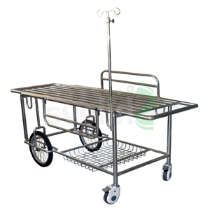 规格:1950*650*780mm(L*W*H) * 整体采用高级不锈钢焊接而成,焊接牢固,打磨平整。 * 车身带有不锈钢护栏及伸缩式输液架,为医护人员对病者进行急救提供方便。 * 轮子采用两大两小轮式设计,推动省力,前行方便。 * 车身下配有储物框,可盛放所需物品。