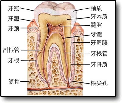 1.牙釉质:覆盖于牙冠表面,是牙体组织中高度钙化的最坚硬的部分。它半透明,呈乳白色, 2.牙骨质:覆盖于牙根表面,色淡黄,硬度和骨相似,在牙颈部较薄,在根尖和磨牙根分叉处较厚。 3.牙本质:构成牙齿的主体,位于牙釉质和牙骨质的内层,色淡黄,硬度比釉质低,比骨组织稍高。牙本质中央的髓腔内充满牙髓组织。 4.牙髓;是位于髓腔内的疏松结缔组织,主要是血管、神经和淋巴管。其周围被坚硬的牙本质所包围。