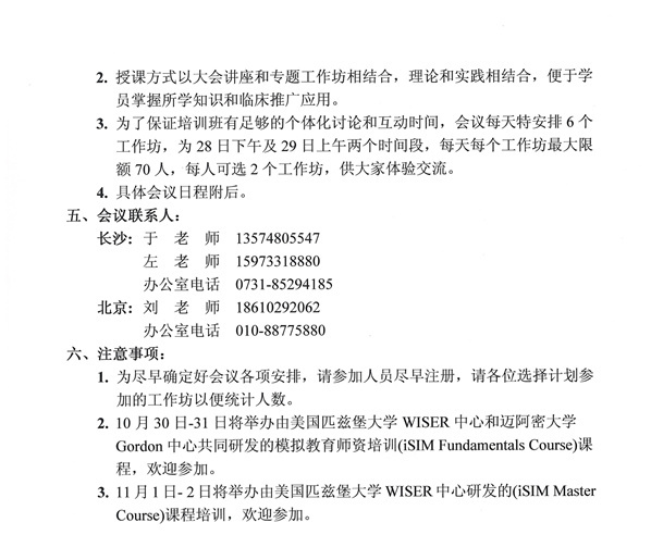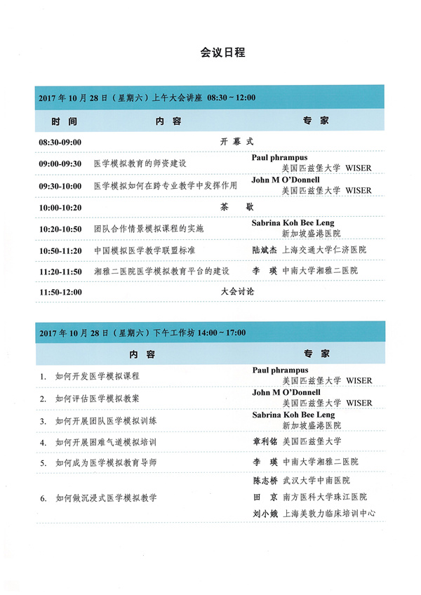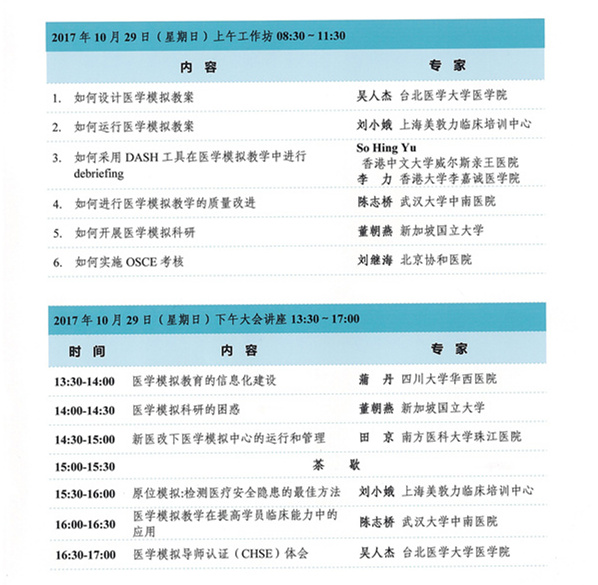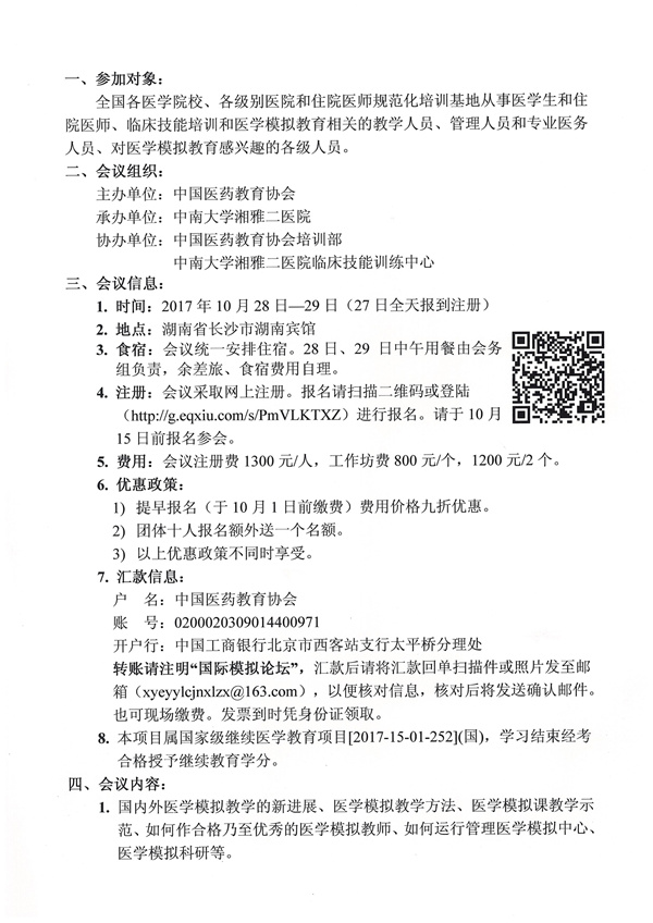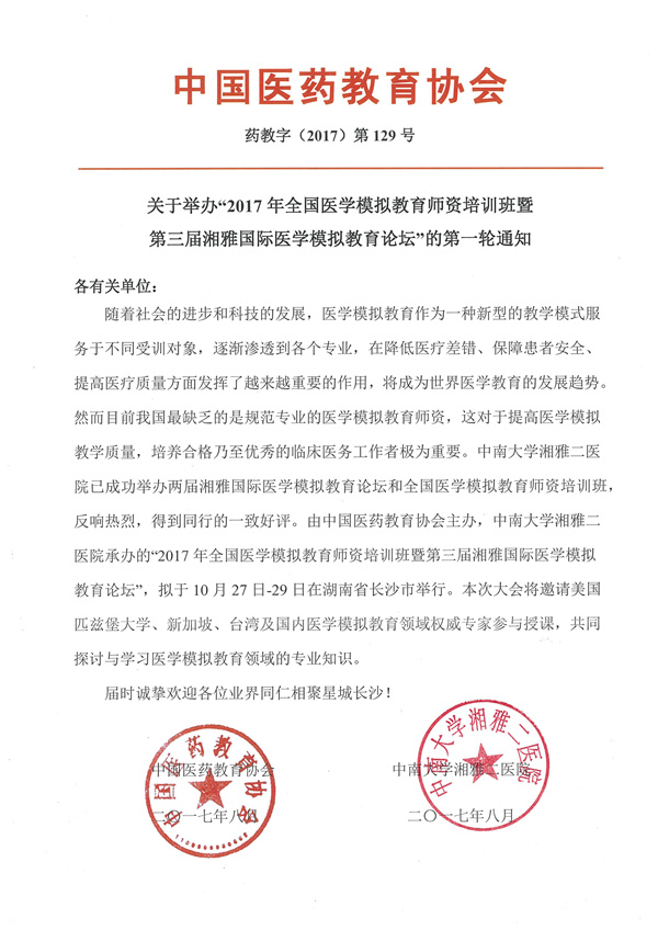 2017年全国医学模拟教育师资培训班暨第三届湘雅国际医学模拟教育论坛今年10月28-29日在长沙举办,届时来自美国、新加坡、香港、台湾和国内专家将有精彩演讲和工作坊!欢迎派人来交流。