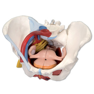该六分体女性骨盆模型能在局部解剖学方面显示出骨、韧带、脉管、神经、骨盆肌肉以及女性盆腔内器管等各种解剖细节的组成。该模型在正中矢状面上显示骨盆底整体结构,即肛门外括约肌、尿道外括约肌、会阴浅横肌、会阴深横肌与球海绵体肌等各个部位均可拆卸。直肠、连带输卵管与卵巢的子宫以及****等结构亦可沿正中矢状面拆卸为两半部分。该骨盆模型的右半部能显示髂总动脉、髂内外动脉以及髂总静脉与髂外静脉的髂分布等局部解剖学状况也能显示右既丛、右坐骨神经与右阴部神经的情况。所显示的骨与韧带等结构可涉及左右两侧髋骨、耻骨联合、骶骨、尾骨、连带椎间盘的第五腰椎等。模型通过第五腰椎,骶骨与尾骨的正中矢状面将骨盆分为左右两半部分并能显示椎管中的马尾成分。第五腰椎椎体的左半部可以拆下。模型的右半部分可显示骨盆韧带即腹股沟韧带、骶结节韧带、骶棘韧带、骶髂前韧带、骼腰韧带、前纵韧带、骶髂骨间韧带、骶髂骼后韧带,以及闭孔膜等结构。