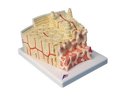 这款极为精细的模型以三维立体表现板层骨的一个断面,放大80倍展示了典型的管状骨胳。表现的是骨骼各个层次的纵切面横切面,以及一个骨髓内结构的两级切面。板层骨的典型特征非常明显,有助于理解骨单位的组成和功能,也称为哈氏系统(Haversian system)。各单个组成部分,诸如海绵质、致密质、骨内膜、皮质质、骨细胞、弗克曼氏管(Volkmann canals)和哈氏管(Haversian canals),可借助这款模型解释得非常清楚。置于基架上。