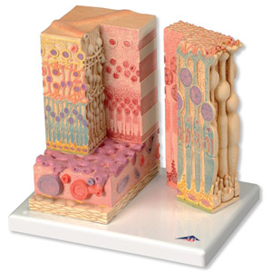 模型显示视网膜、脉络膜以及巩膜的微观结构。左侧模块显示视网膜的完整结构及其血管层组成,巩膜部位的光镜微观结构。模型右半部被部分放大,显示出光感细胞的显微结构以及色素层细 胞的形态。