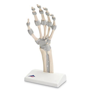 该单部分模型,详细展示出手部韧带的解剖学细节。弹性韧带可供展示手腕和手指的灵活性。腕骨(手腕骨),掌骨(手掌骨)以及指骨(手指骨)都作为骨性结构显示。在前臂的远端区域,呈现出桡骨和尺骨。